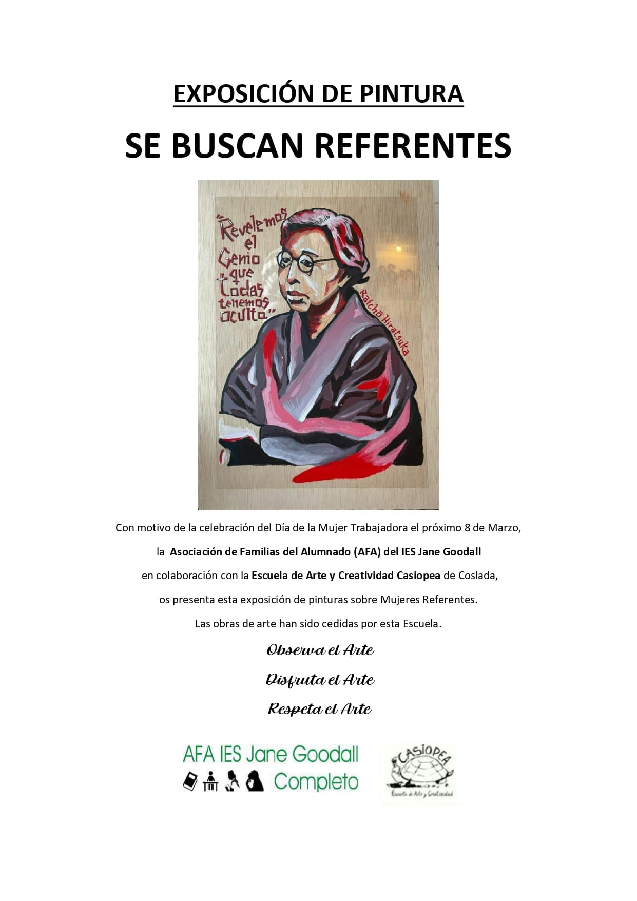 Con motivo de la celebración del Día de la Mujer Trabajadora el próximo 8 de Marzo, desde la (AFA) Asociación de Familias del Alumnado del IES Jane Goodall en colaboración con la Escuela de Arte y Creatividad Casiopea de Coslada, os presentamos esta exposición de pinturas sobre Mujeres Referentes.